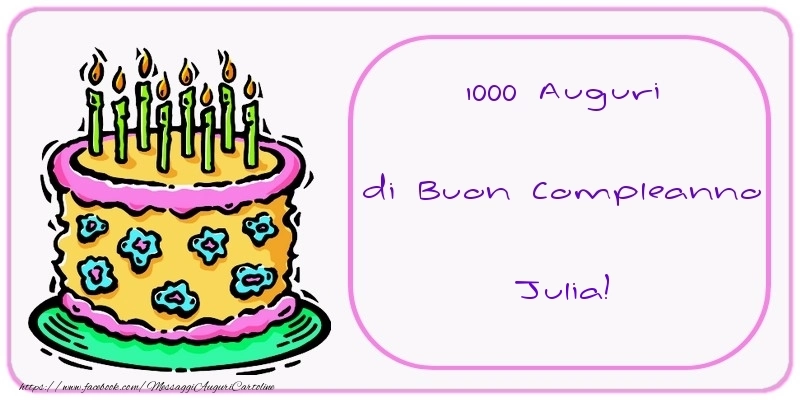 Cartolina con nome Julia di compleanno con disegno con torta con candele su sfondo bianco con bordo e frase di buon compleanno 1000 Auguri di Buon Compleanno Julia.