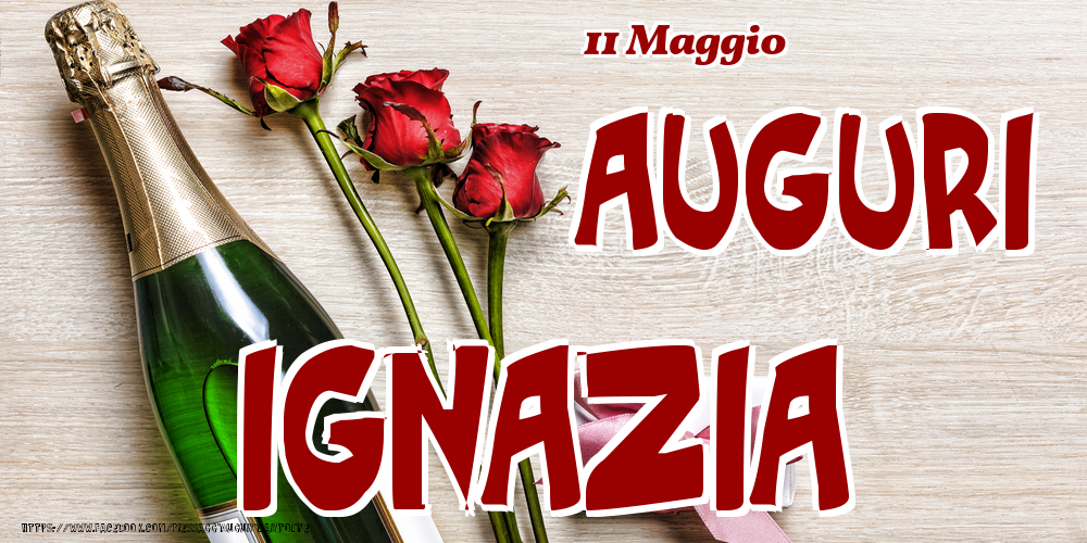 11 Maggio - Auguri Ignazia! | Cartolina con tre rose, champagne e regalo | Cartoline di onomastico