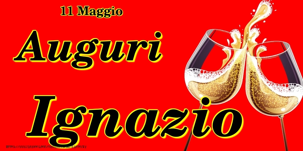 11 Maggio - Auguri Ignazio! | Cartolina con bicchieri di champagne su sfondo rosso | Cartoline di onomastico