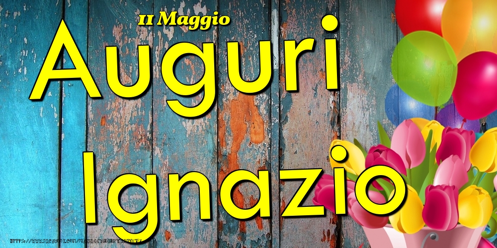 11 Maggio - Auguri Ignazio! | Cartolina con tulipani e palloncini su sfondo in legno | Cartoline di onomastico