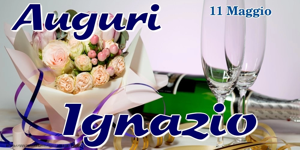 11 Maggio - Auguri Ignazio! | Cartolina con bouquet di fiori e champagne | Cartoline di onomastico