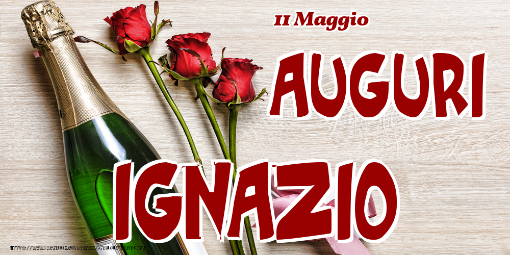 11 Maggio - Auguri Ignazio! | Cartolina con tre rose, champagne e regalo | Cartoline di onomastico