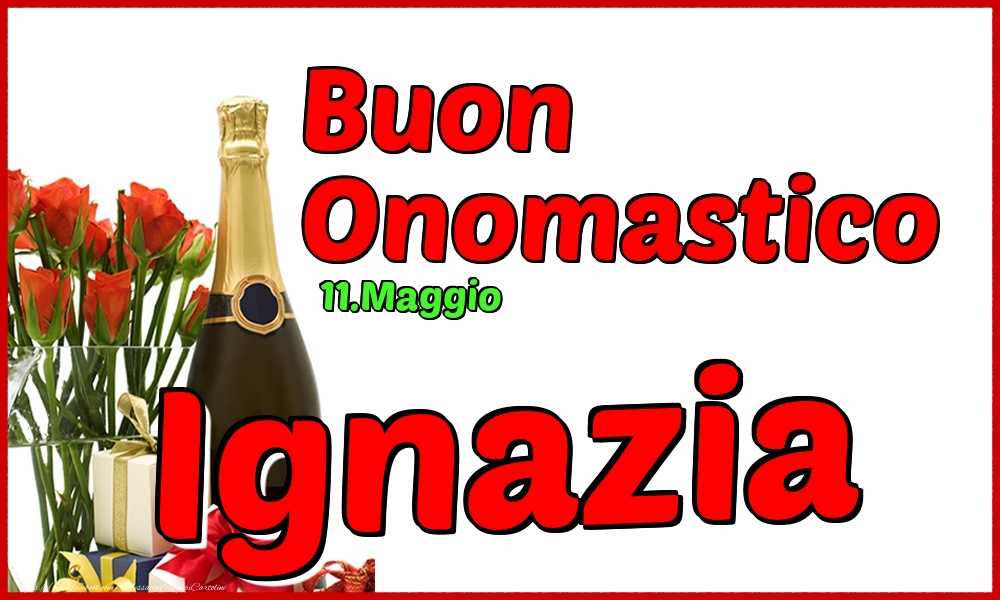 11.Maggio - Buon Onomastico Ignazia! | Cartolina con champagne, rose e regalo su sfondo bianco | Cartoline di onomastico