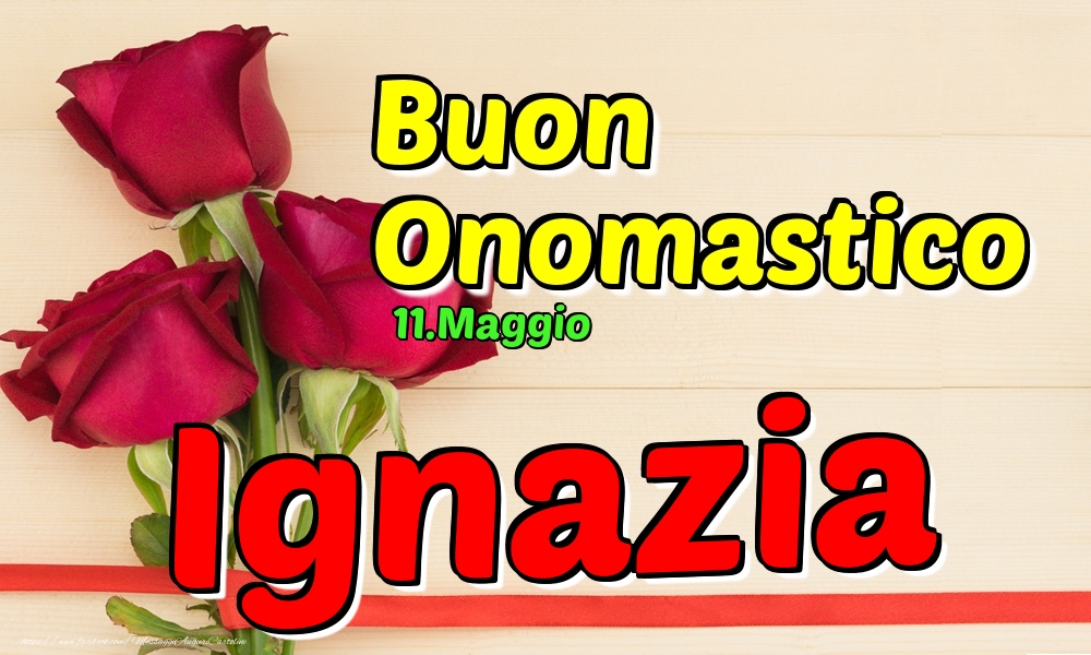 11.Maggio - Buon Onomastico Ignazia! | Cartolina con tre rose rosse con scritta gialla | Cartoline di onomastico