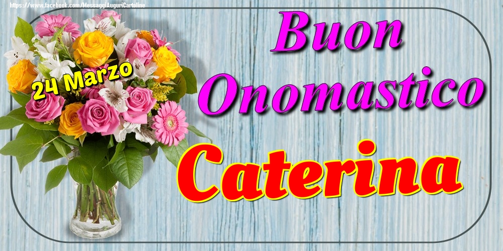 24 Marzo - Buon Onomastico Caterina! | Cartolina con bouquet di fiori in vaso | Cartoline di onomastico