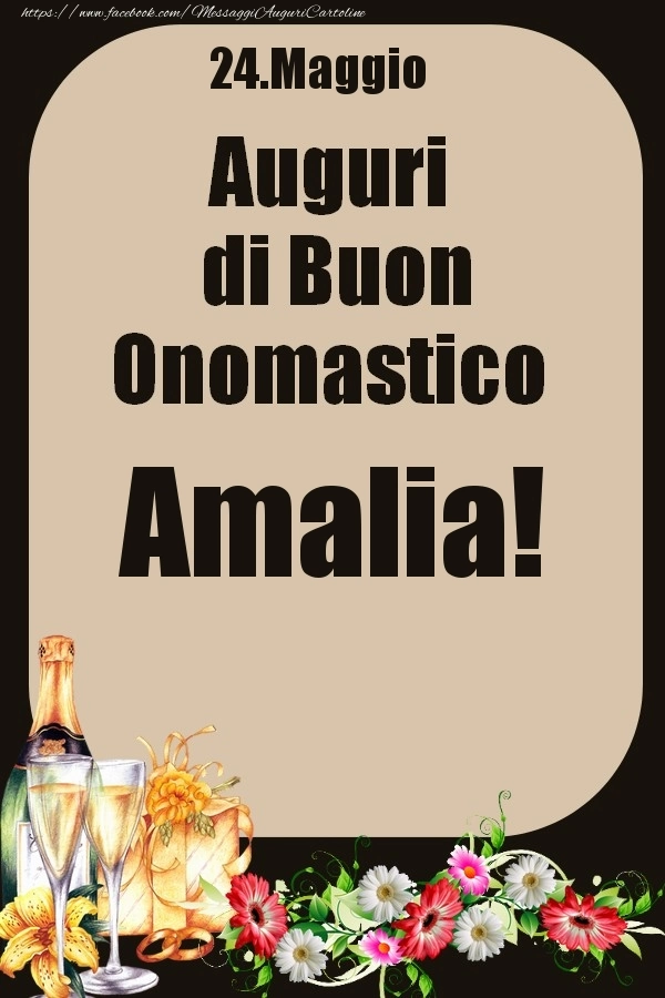Cartolina con nome Amalia di onomastico con composizione con champagne e fiori per signori o signore e frase di buon onomastico 24.Maggio - Auguri di Buon Onomastico Amalia!.