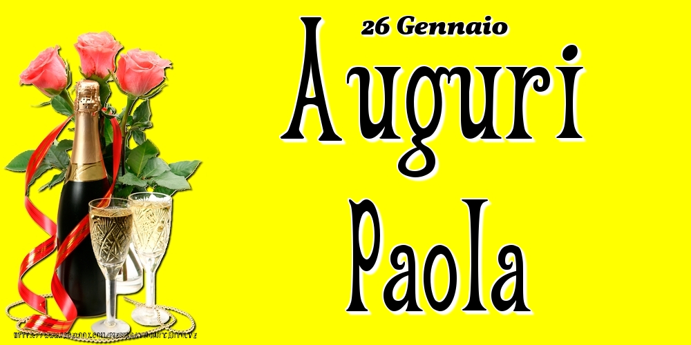 26 Gennaio - Auguri Paola! | Cartolina con rose rosa e champagne su sfondo giallo | Cartoline di onomastico