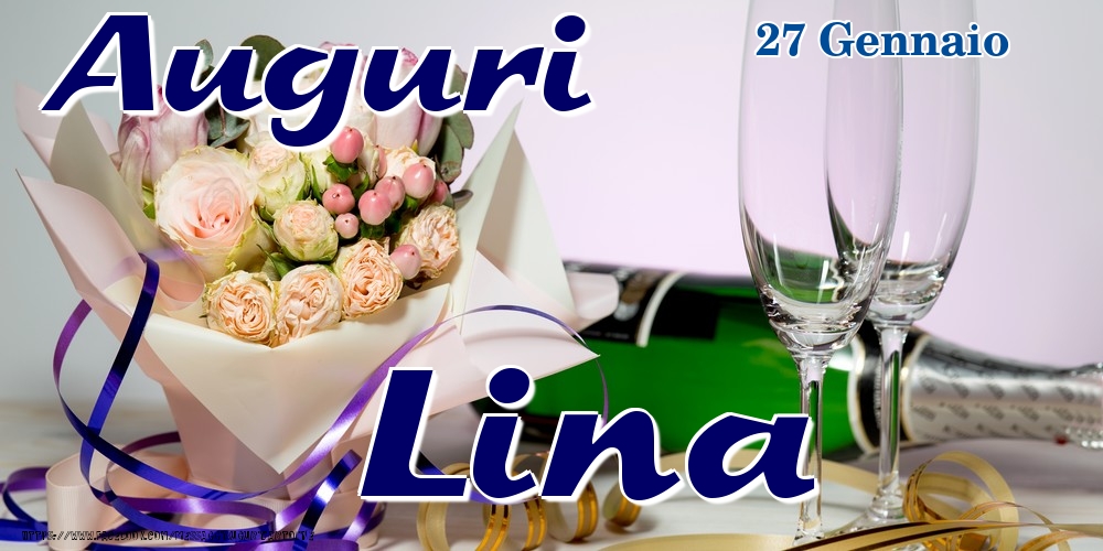 27 Gennaio - Auguri Lina! | Cartolina con bouquet di fiori e champagne | Cartoline di onomastico