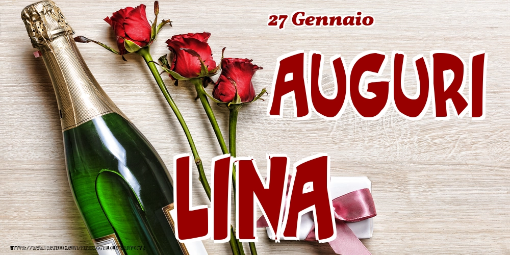 27 Gennaio - Auguri Lina! | Cartolina con tre rose, champagne e regalo | Cartoline di onomastico