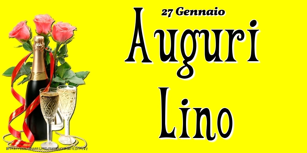 27 Gennaio - Auguri Lino! | Cartolina con rose rosa e champagne su sfondo giallo | Cartoline di onomastico