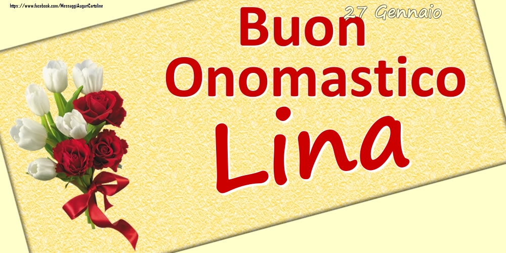 27 Gennaio: Buon Onomastico Lina | Cartolina con tulipani bianchi e rose rosse | Cartoline di onomastico