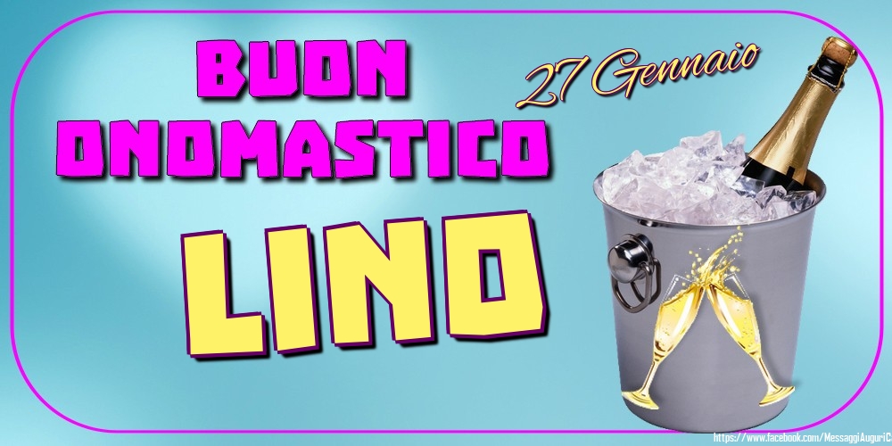 27 Gennaio - Buon Onomastico Lino! | Cartolina con champagne e bicchieri su sfondo blu | Cartoline di onomastico