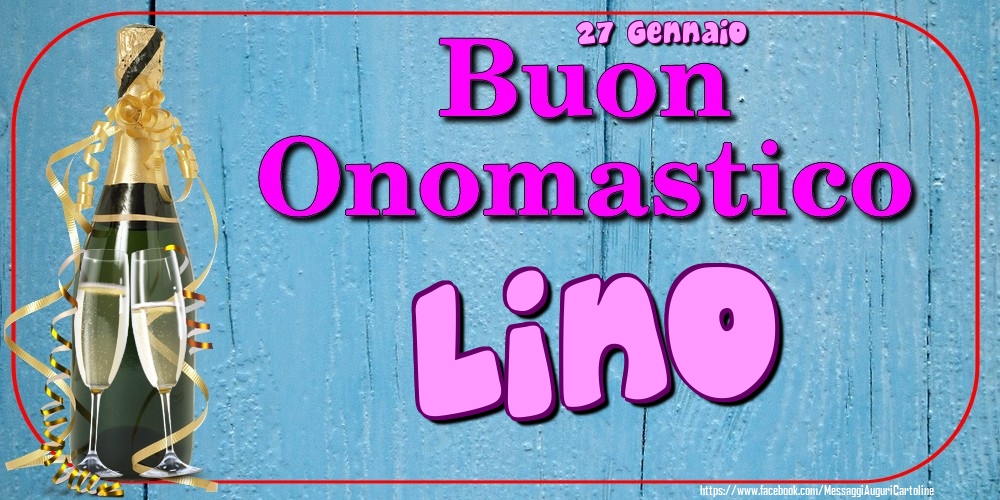 27 Gennaio - Buon Onomastico Lino! | Cartolina con champagne e bicchieri su sfondo vintage in legno | Cartoline di onomastico