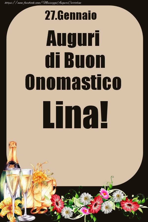 27.Gennaio - Auguri di Buon Onomastico  Lina! | Cartolina con composizione con champagne e fiori per signori o signore | Cartoline di onomastico