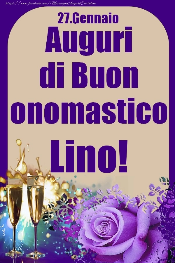 27.Gennaio - Auguri di Buon Onomastico  Lino! | Cartolina con bicchieri di champagne e rosa | Cartoline di onomastico