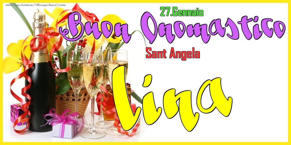 27.Gennaio - Buon Onomastico Lina! | Cartolina con champagne con bicchieri, fiori gialli e regali | Cartoline di onomastico