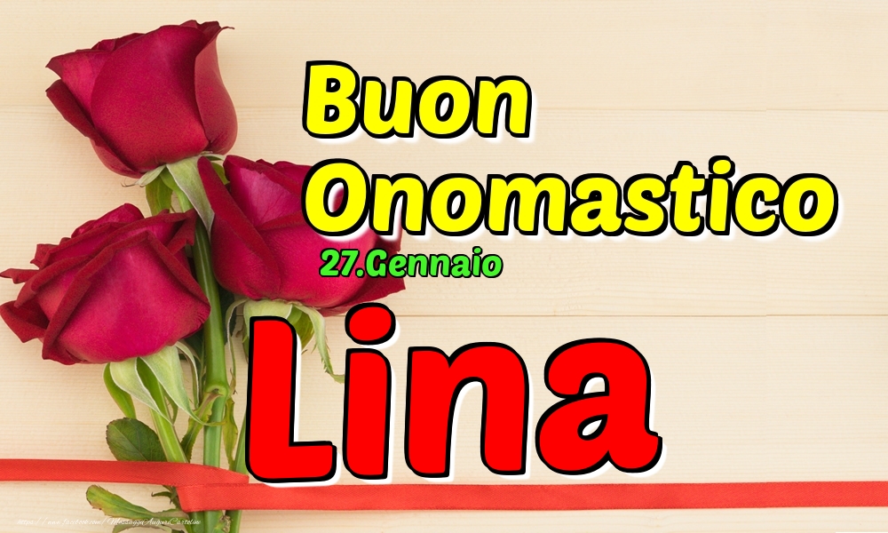 27.Gennaio - Buon Onomastico Lina! | Cartolina con tre rose rosse con scritta gialla | Cartoline di onomastico