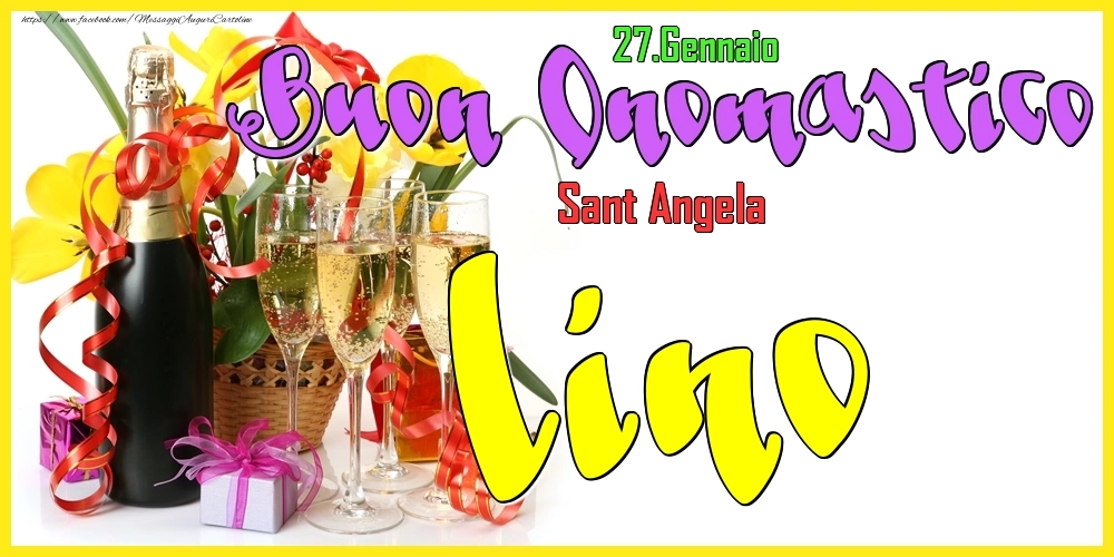27.Gennaio - Buon Onomastico Lino! | Cartolina con champagne con bicchieri, fiori gialli e regali | Cartoline di onomastico