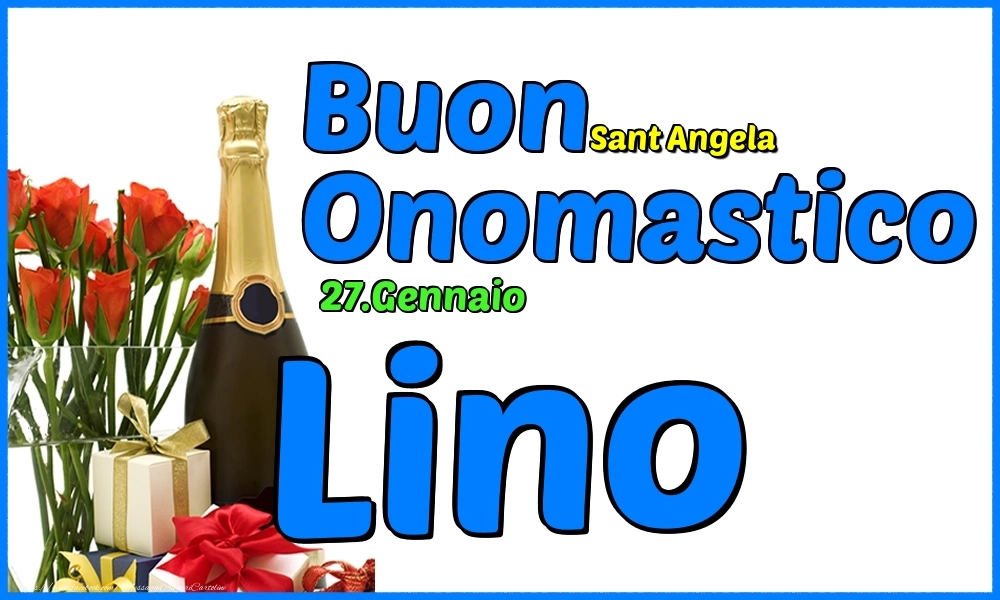 27.Gennaio - Buon Onomastico Lino! | Cartolina con rose e champagne su sfondo bianco e scritta blu | Cartoline di onomastico