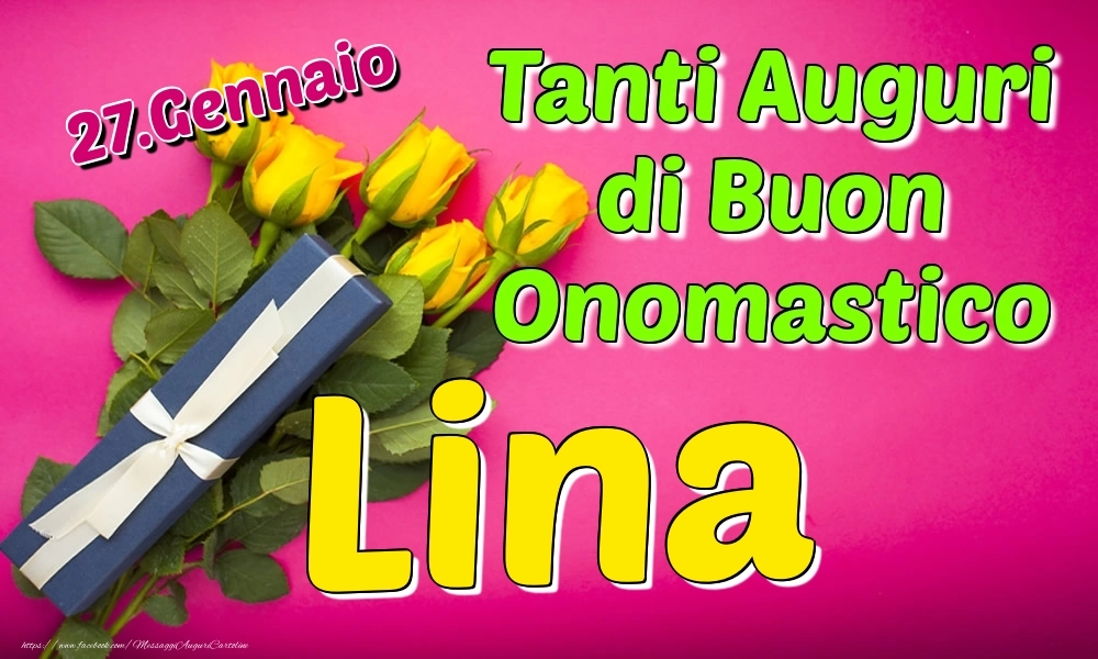 Scopri questa cartolina con rose gialle e regalo per donne unica e personalizzata per la festa dell'onomastico e preparati a condividere un momento di gioia e felicità con il destinatario. Che tu stia inviando il messaggio a distanza o desideri sorprendere la persona amata, questo biglietto di auguri con il nome Lina renderà la festa dell'onomastico davvero speciale e memorabile. Questo biglietto di auguri di onomastico con nome Lina può essere scaricata gratis o inviare tramite Whatsapp, Facebook, Twitter, Pinterest. Immagine di buon onomastico con rose gialle e regalo per donne e dimensioni 1000px x 600px.