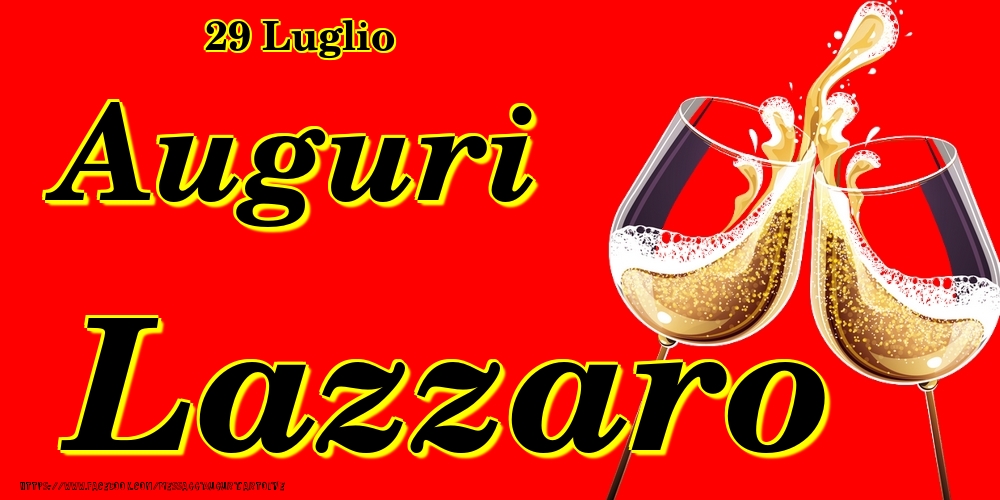 29 Luglio - Auguri Lazzaro! | Cartolina con bicchieri di champagne su sfondo rosso | Cartoline di onomastico