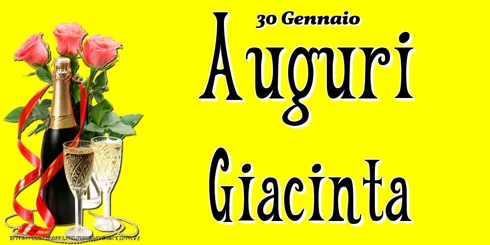 30 Gennaio - Auguri Giacinta! | Cartolina con rose rosa e champagne su sfondo giallo | Cartoline di onomastico