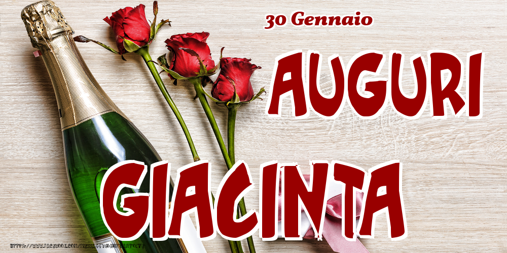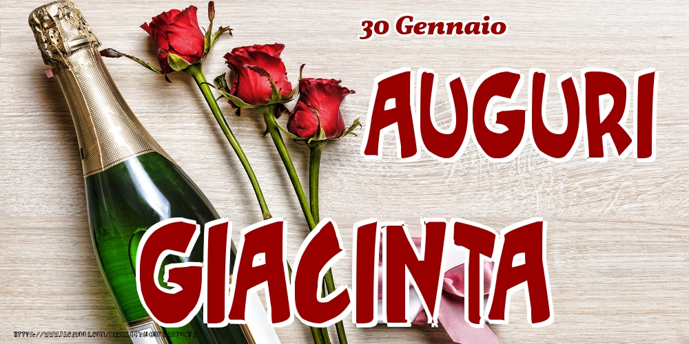 30 Gennaio - Auguri Giacinta! | Cartolina con tre rose, champagne e regalo | Cartoline di onomastico