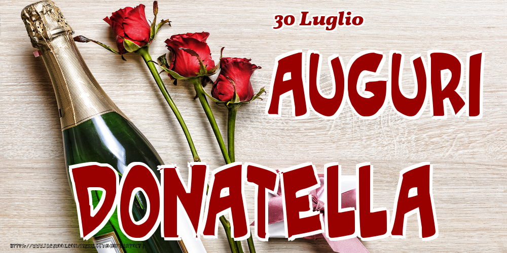 30 Luglio - Auguri Donatella! | Cartolina con tre rose, champagne e regalo | Cartoline di onomastico