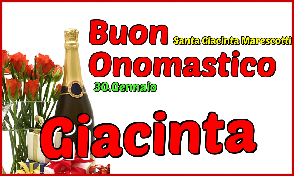 30.Gennaio - Buon Onomastico Giacinta! | Cartolina con champagne, rose e regalo su sfondo bianco | Cartoline di onomastico