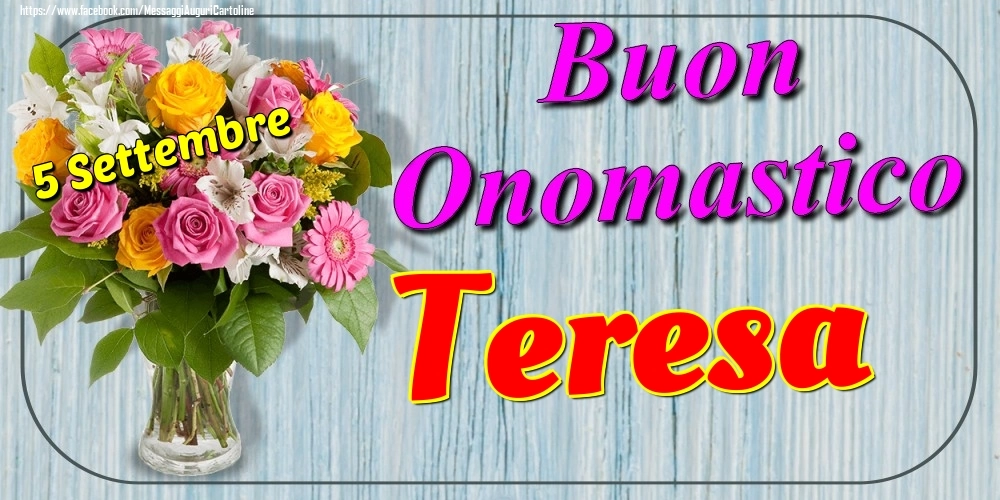 5 Settembre - Buon Onomastico Teresa! | Cartolina con bouquet di fiori in vaso | Cartoline di onomastico