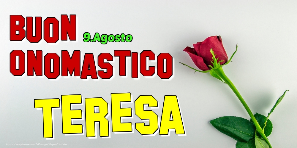 9.Agosto - Buon Onomastico Teresa! | Cartolina con rosa rossa per ragazze | Cartoline di onomastico