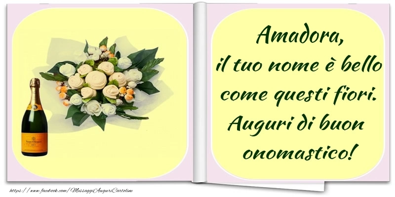 Cartolina con nome Amadora di onomastico con champagne e fiori per donne e frase di buon onomastico Amadora, il tuo nome è bello come questi fiori. Auguri di buon onomastico!.