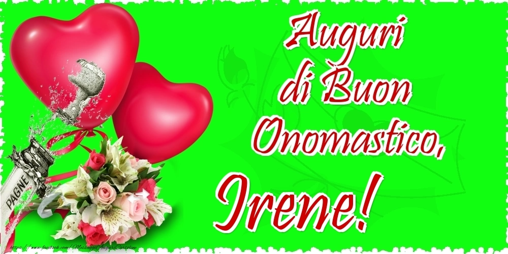 Scopri questa cartolina con champagne, cuore e fiori unica e personalizzata per la festa dell'onomastico e preparati a condividere un momento di gioia e felicità con il destinatario. Che tu stia inviando il messaggio a distanza o desideri sorprendere la persona amata, questo biglietto di auguri con il nome Irene renderà la festa dell'onomastico davvero speciale e memorabile. Questo biglietto di auguri di onomastico con nome Irene può essere scaricata gratis o inviare tramite Whatsapp, Facebook, Twitter, Pinterest. Immagine di buon onomastico con champagne, cuore e fiori e dimensioni 1000px x 500px.