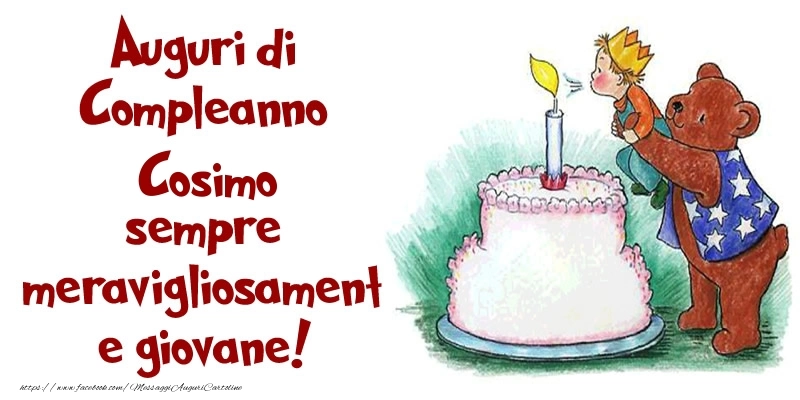 Auguri di Compleanno Cosimo sempre meravigliosamente giovane! | Cartolina con orso e bambino che spengono la candelina sulla torta | Cartoline di compleanno