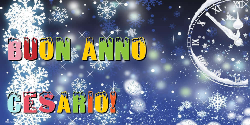 Buon Anno Cesario! | Cartolina con orologio su sfondo di fiocco di neve | Cartoline di buon anno
