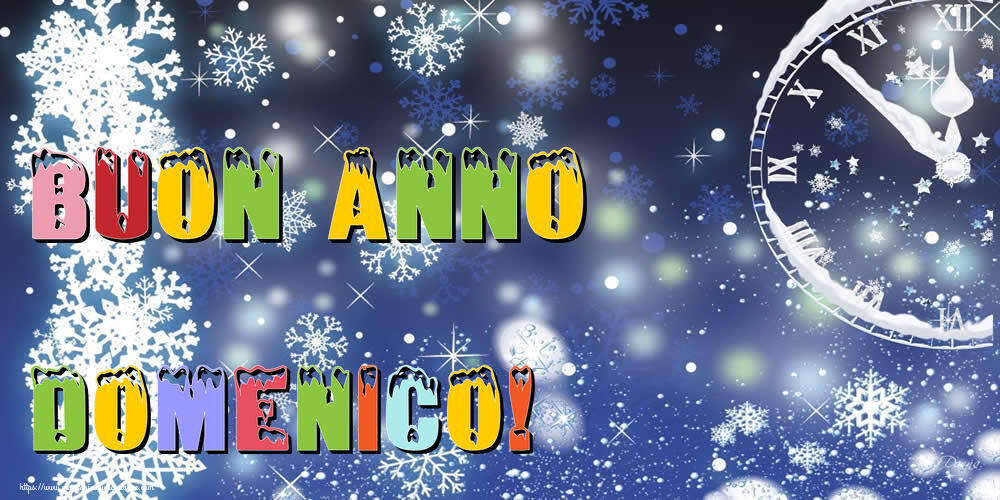 Buon Anno Domenico! | Cartolina con orologio su sfondo di fiocco di neve | Cartoline di buon anno