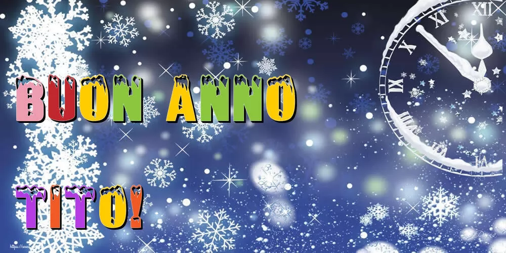 Buon Anno Tito! | Cartolina con orologio su sfondo di fiocco di neve | Cartoline di buon anno