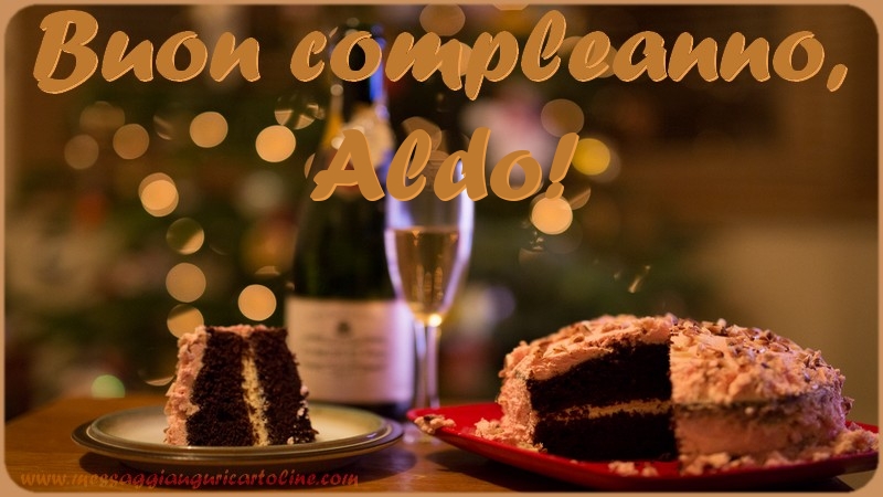 Buon compleanno, Aldo | Cartolina con torta al cioccolato e champagne | Cartoline di compleanno