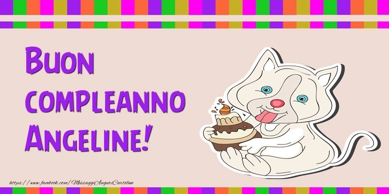 Buon compleanno Angeline! | Cartolina con gatto con torta | Cartoline di compleanno