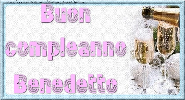 Questa cartolina d'auguri personalizzato con champagne e bicchieri è decorato con un design festivo e pieno di colore, perfetto per riflettere la gioia e l'allegria di un compleanno. Il nome del destinatario, Benedetto, è il fulcro di questo biglietto, inciso con eleganza e raffinatezza per farlo sentire davvero speciale nel giorno del suo compleanno. Questo biglietto di auguri con il nome Benedetto può essere scaricata gratis o inviare tramite Whatsapp, Facebook, Twitter, Pinterest. Immagine di auguri buon compleanno con champagne e bicchieri e dimensioni 600px x 323px.
