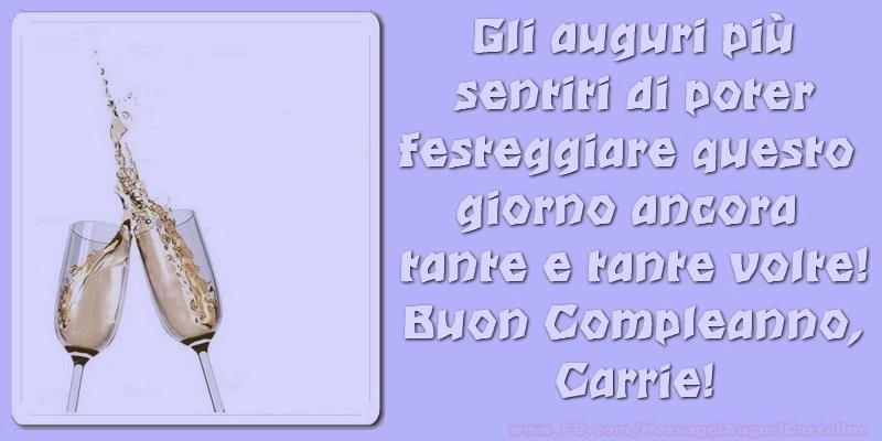Con questa cartolina con bicchieri di champagne, riuscirai a portare una gioia immensa al festeggiato nel giorno del suo compleanno. È un gesto piccolo, ma pieno d'affetto, che rimarrà per sempre nella sua memoria. Il nome Carrie è il fulcro di questo biglietto, inciso con eleganza e raffinatezza per far sentire davvero speciale il festeggiato nel giorno del suo compleanno. Questo biglietto di auguri di compleanno con il nome Carrie può essere scaricata gratis o inviare tramite Whatsapp, Facebook, Twitter, Pinterest. Immagine di buon compleanno con bicchieri di champagne e dimensioni 800px x 400px.