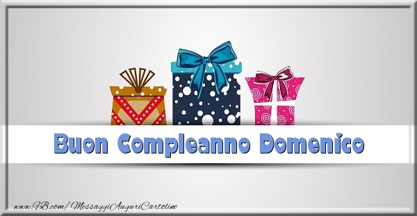 Buon Compleanno Domenico | Cartolina con regali su sfondo grigio | Cartoline di compleanno