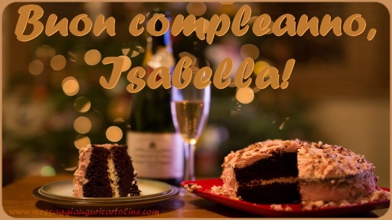 Buon compleanno, Isabella | Cartolina con torta al cioccolato e champagne | Cartoline di compleanno