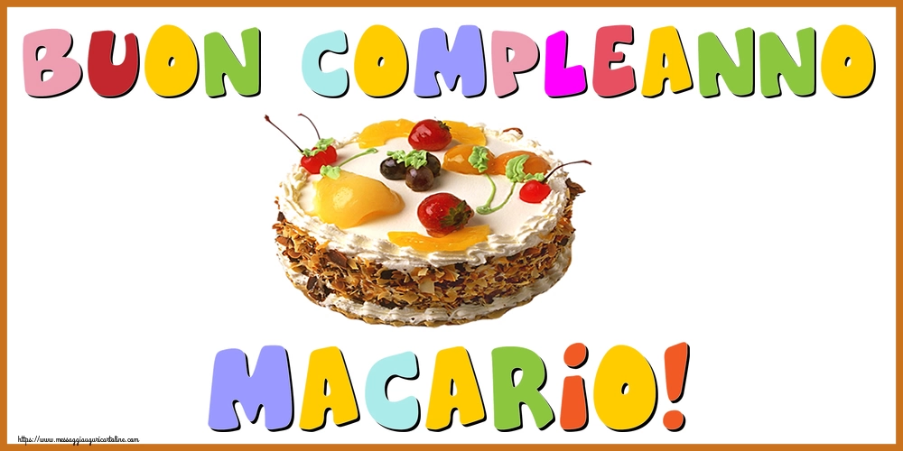 Buon Compleanno Macario! | Cartolina con torta alla frutta e scritte multicolori | Cartoline di compleanno