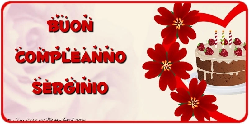 Buon Compleanno Serginio | Cartolina con torta e fiori e scritte con i cuori | Cartoline di compleanno