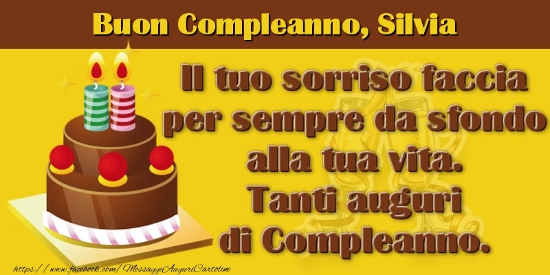 Con questa cartolina con torta su sfondo giallo, riuscirai a portare una gioia immensa al festeggiato nel giorno del suo compleanno. È un gesto piccolo, ma pieno d'affetto, che rimarrà per sempre nella sua memoria. Il nome Silvia è il fulcro di questo biglietto, inciso con eleganza e raffinatezza per far sentire davvero speciale il festeggiato nel giorno del suo compleanno. Questo biglietto di auguri di compleanno con il nome Silvia può essere scaricata gratis o inviare tramite Whatsapp, Facebook, Twitter, Pinterest. Immagine di buon compleanno con torta su sfondo giallo e dimensioni 800px x 400px.