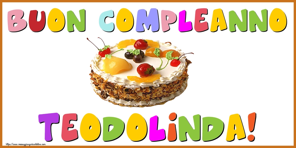 Con questa cartolina con torta alla frutta e scritte multicolori, riuscirai a portare una gioia immensa al festeggiato nel giorno del suo compleanno. È un gesto piccolo, ma pieno d'affetto, che rimarrà per sempre nella sua memoria. Il nome Teodolinda è il fulcro di questo biglietto, inciso con eleganza e raffinatezza per far sentire davvero speciale il festeggiato nel giorno del suo compleanno. Questo biglietto di auguri di compleanno con il nome Teodolinda può essere scaricata gratis o inviare tramite Whatsapp, Facebook, Twitter, Pinterest. Immagine di buon compleanno con torta alla frutta e scritte multicolori e dimensioni 1000px x 500px.