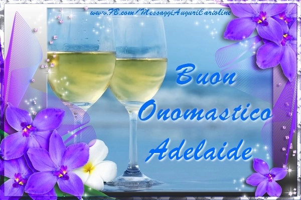 Scopri questa cartolina con bicchieri da champagne e fiori viola unica e personalizzata per la festa dell'onomastico e preparati a condividere un momento di gioia e felicità con il destinatario. Che tu stia inviando il messaggio a distanza o desideri sorprendere la persona amata, questo biglietto di auguri con il nome Adelaide renderà la festa dell'onomastico davvero speciale e memorabile. Questo biglietto di auguri di onomastico con nome Adelaide può essere scaricata gratis o inviare tramite Whatsapp, Facebook, Twitter, Pinterest. Immagine di buon onomastico con bicchieri da champagne e fiori viola e dimensioni 600px x 400px.