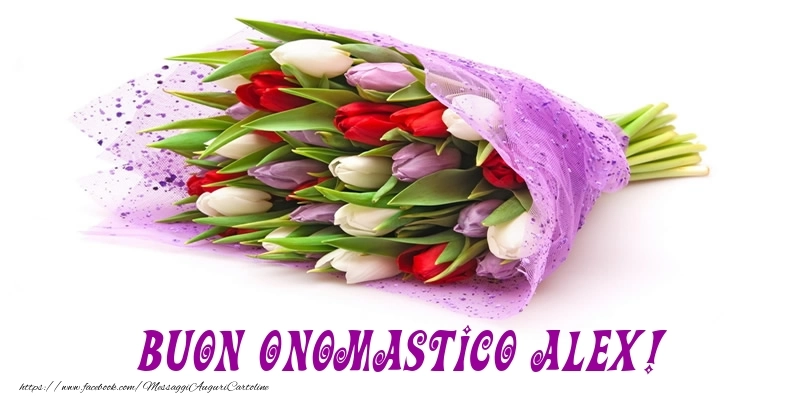 Scopri questa cartolina con mazzo di tulipani unica e personalizzata per la festa dell'onomastico e preparati a condividere un momento di gioia e felicità con il destinatario. Che tu stia inviando il messaggio a distanza o desideri sorprendere la persona amata, questo biglietto di auguri con il nome Alex renderà la festa dell'onomastico davvero speciale e memorabile. Questo biglietto di auguri di onomastico con nome Alex può essere scaricata gratis o inviare tramite Whatsapp, Facebook, Twitter, Pinterest. Immagine di buon onomastico con mazzo di tulipani e dimensioni 800px x 400px.
