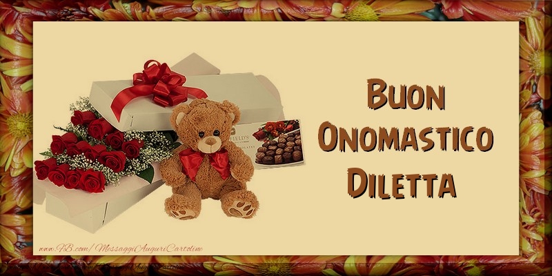 Buon Onomastico Diletta | Cartolina con orsacchiotto e regali | Cartoline di onomastico